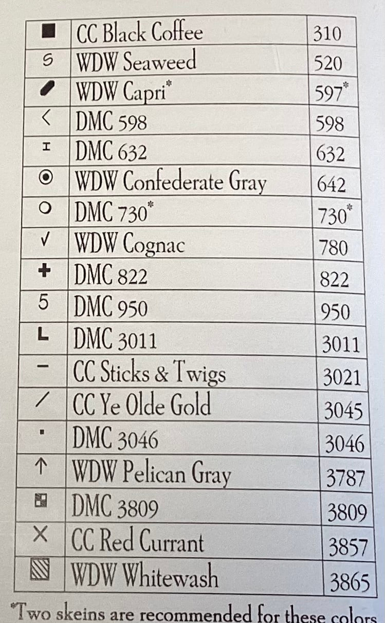 Stitch count: 226 x 155 on 40 count Toasted Almond