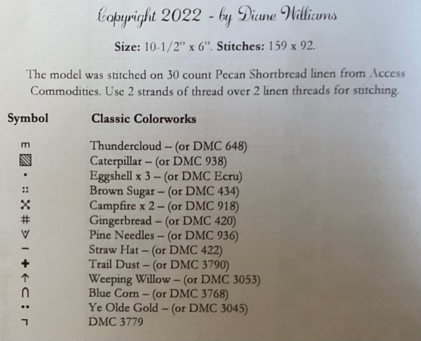 Stitch count: 159 x 92 on 30 count Pecan Shortbread linen from Access Commodities