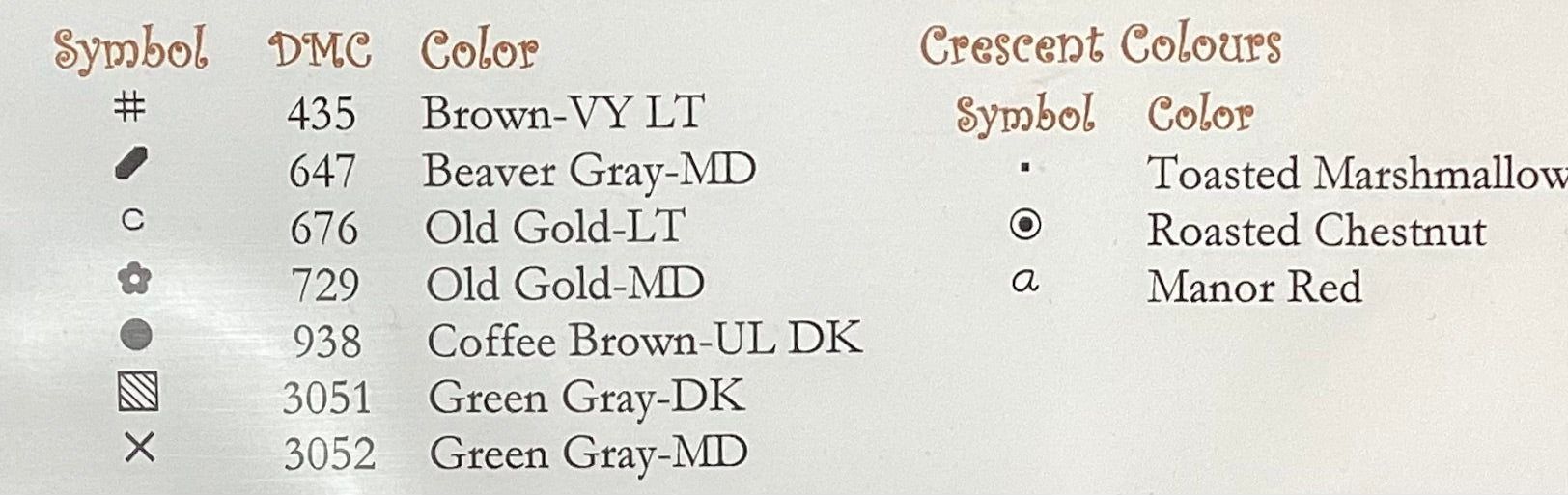 Stitch count: 82 x 54 on 28 count Creme Brulee by R & R Reproduction