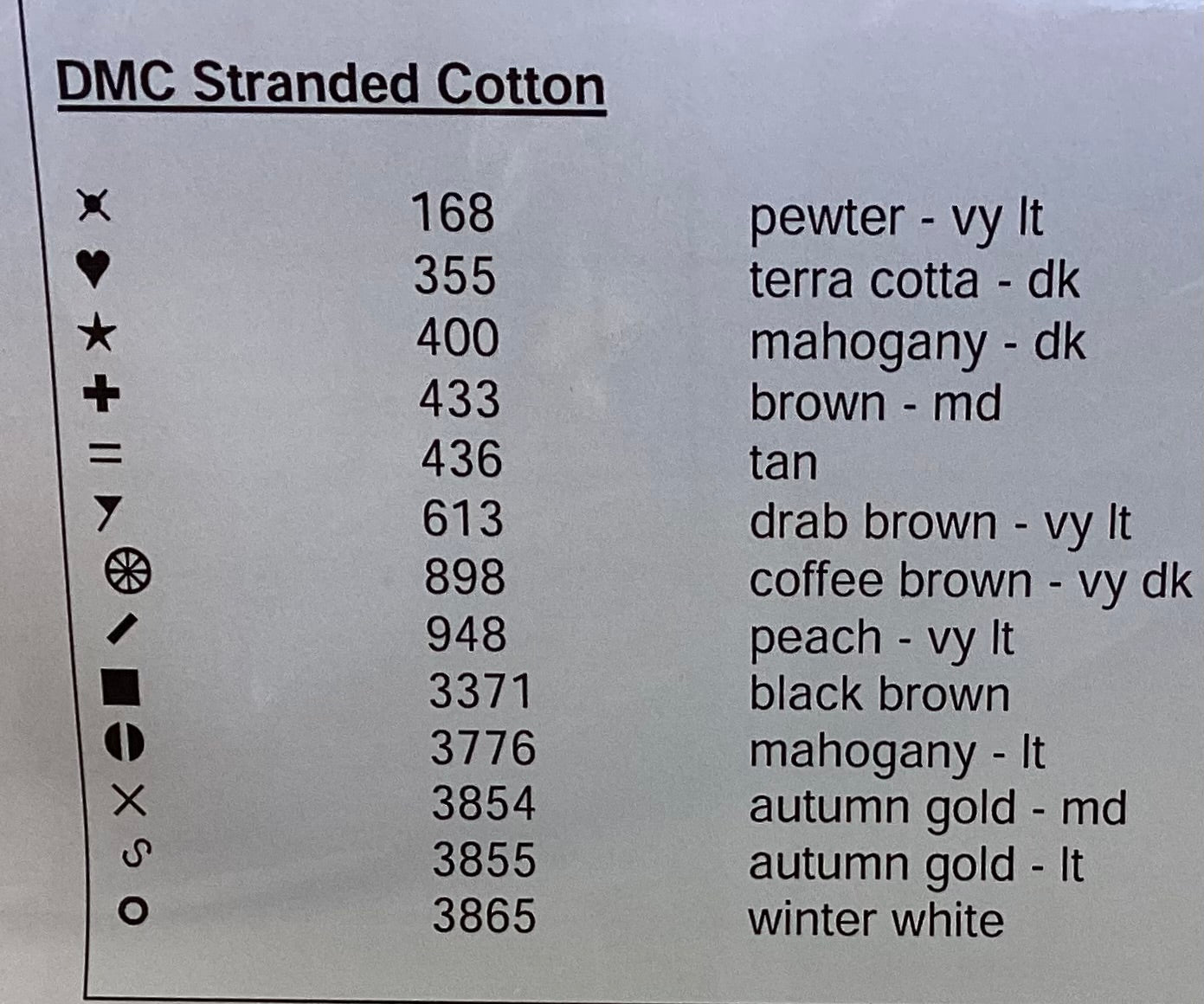 Stitch count: 100 x 160 on 32 count vintage country mocha from Zweigart