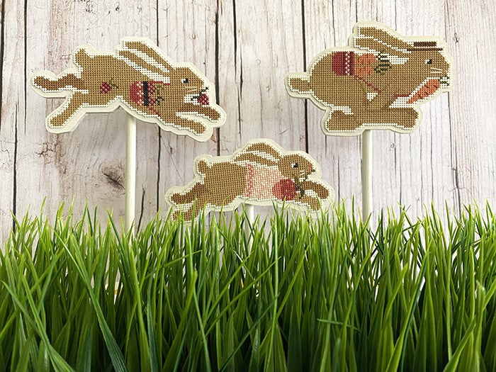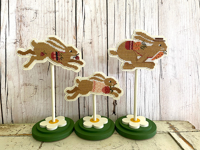 Bunny models are stitched 2 over 1 on 14ct white perforated paper. Stitch counts are 72 x 47, 72 x 34, 81 x 42.