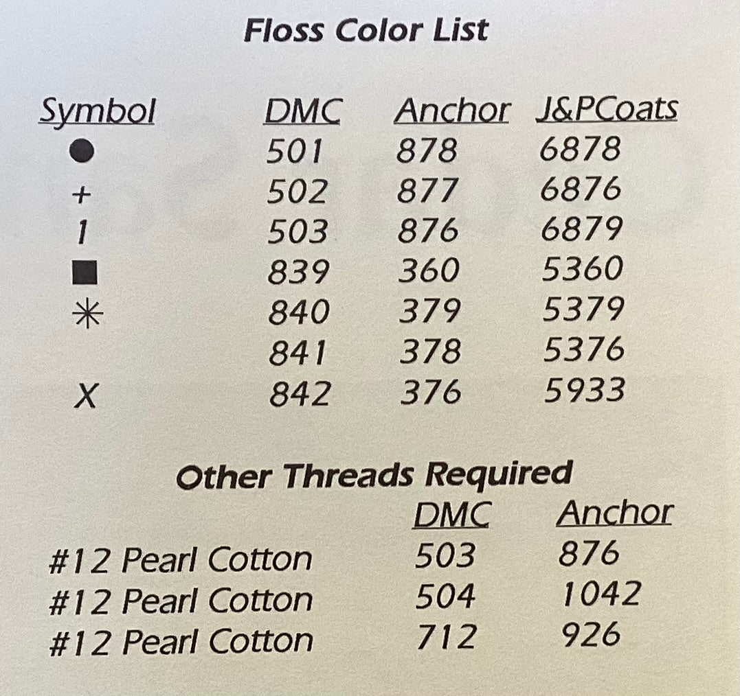 Stitch count: 109 x 46 on 28 count Taupe Cashel linen by Picture from Zweigart
