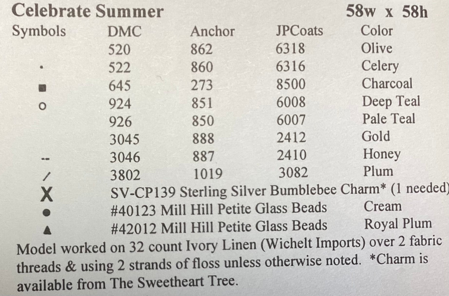 Stitch count:58 x 58 on 32 count Ivory Linen from Wichelt