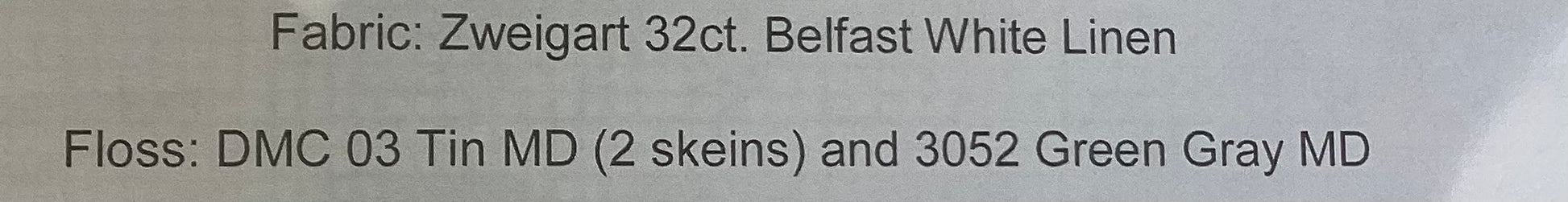 Stitch count: 150 x 112 on 32 count Belfast White linen from Zweigart