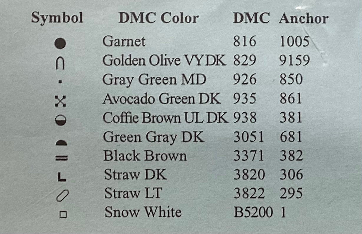 Stitch count: 99 x 82 on 28 count Natural Light linen from Wichelt