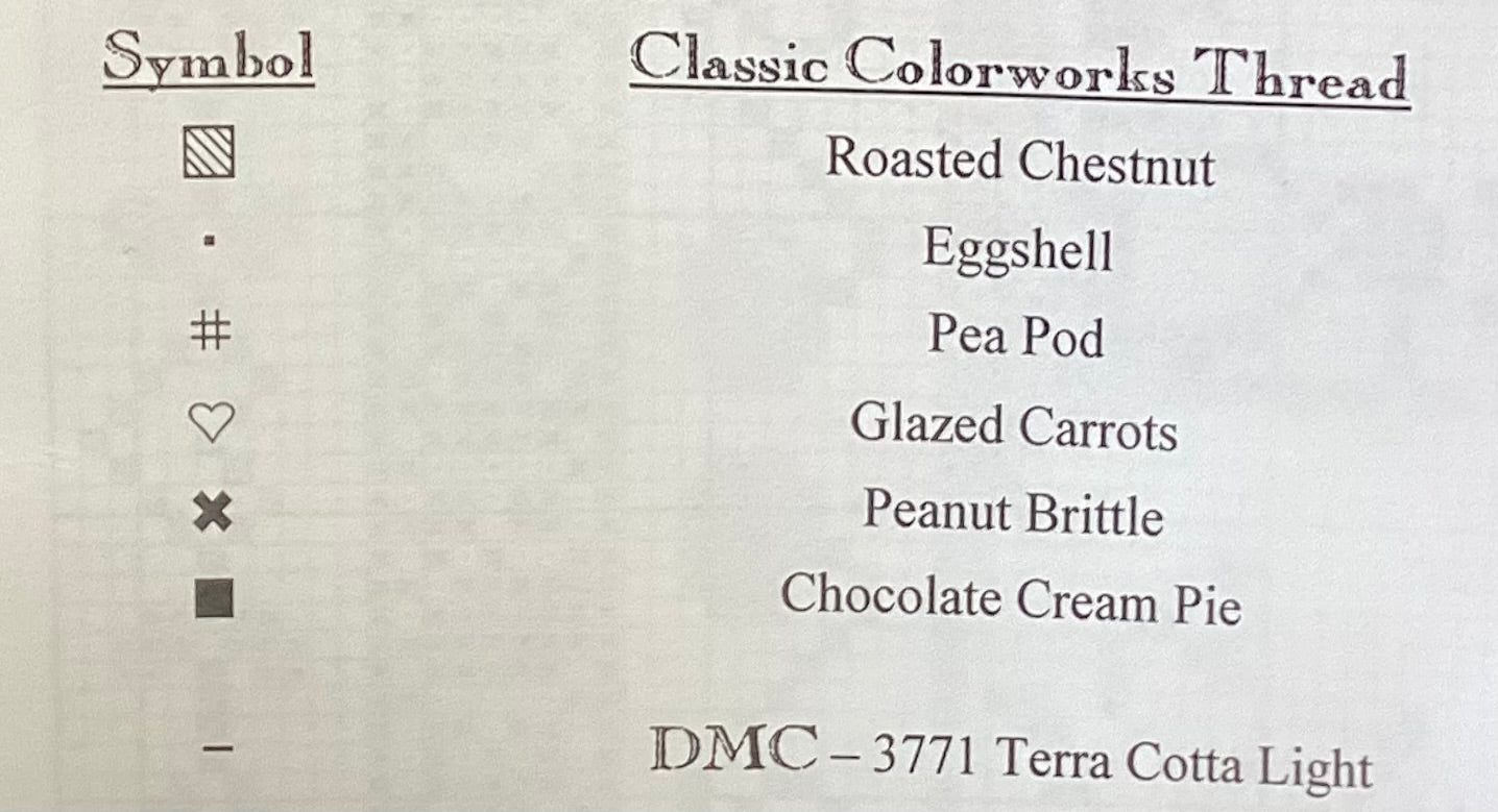 Stitch count: 76 x 123 on 32 count Creek Bed Brown linen from R & R Reproduction
