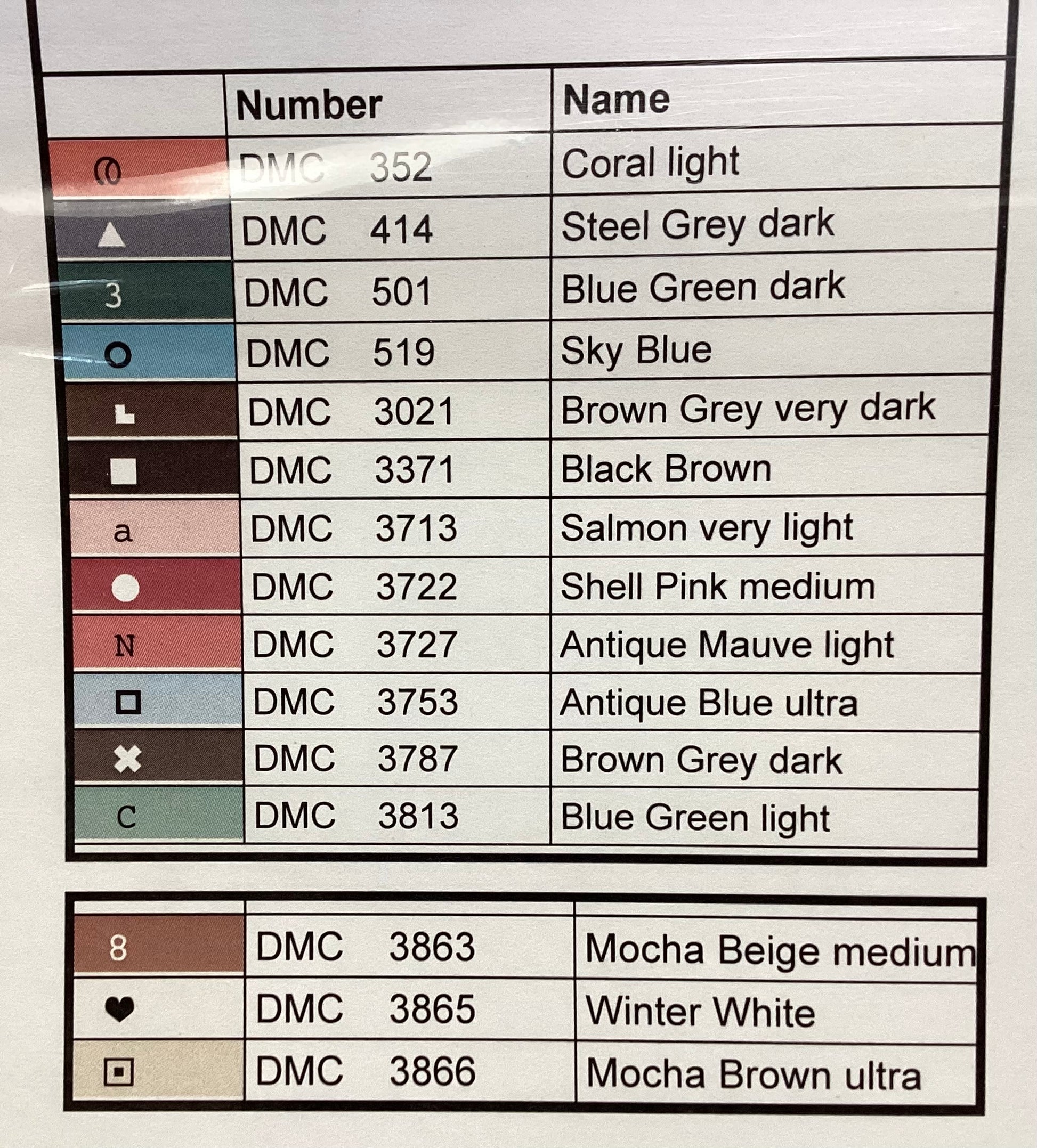 Stitch count: 72 x 72 on 35 count Vintage Country Mocha linen