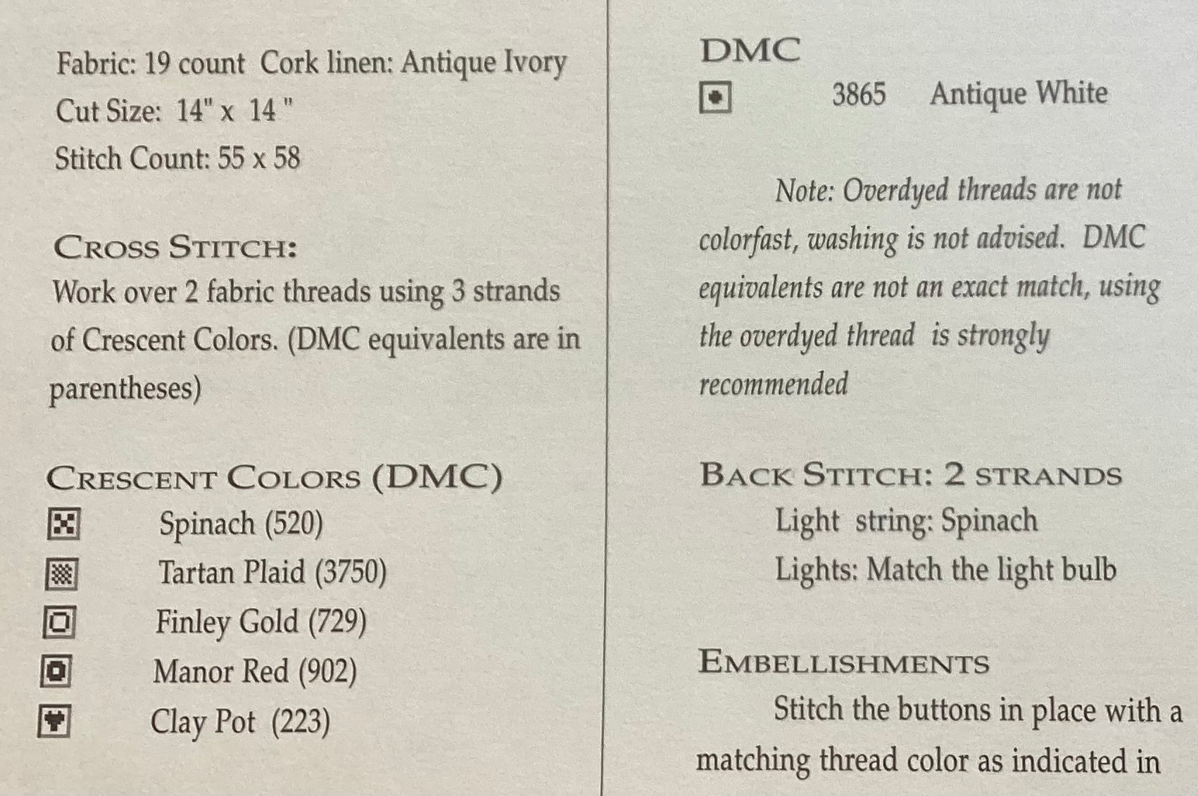 Stitch count: 55 x 58 on 19 count cork linen in antique ivory