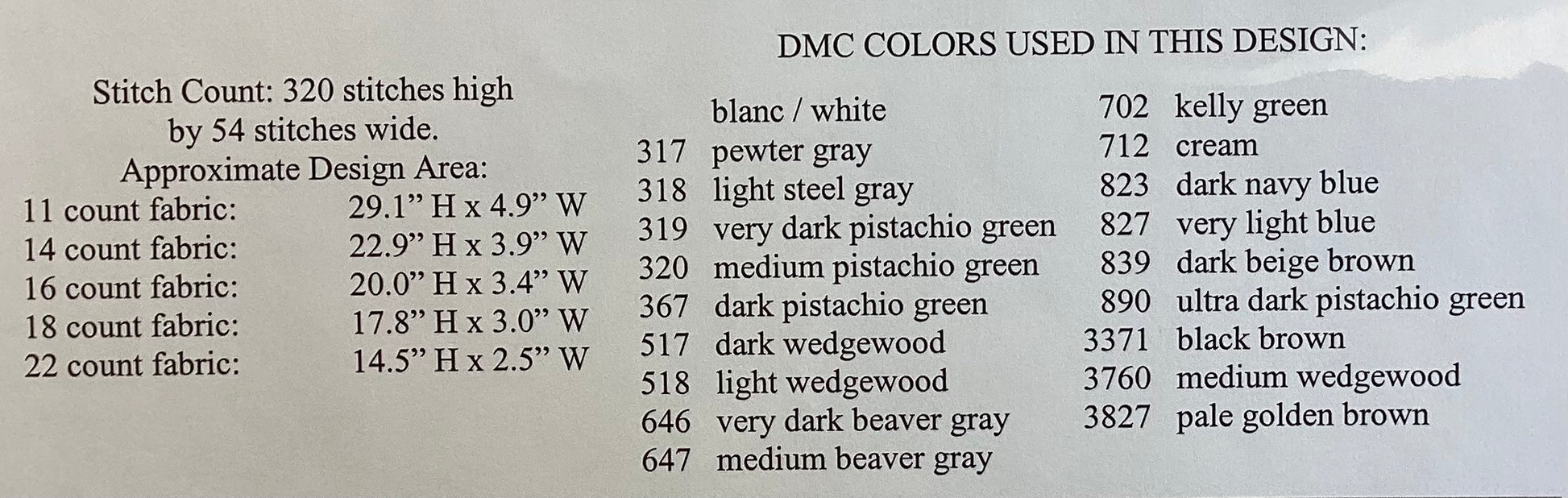 Stitch count: 320 x 54 on 16 count white Charles Craft Aida