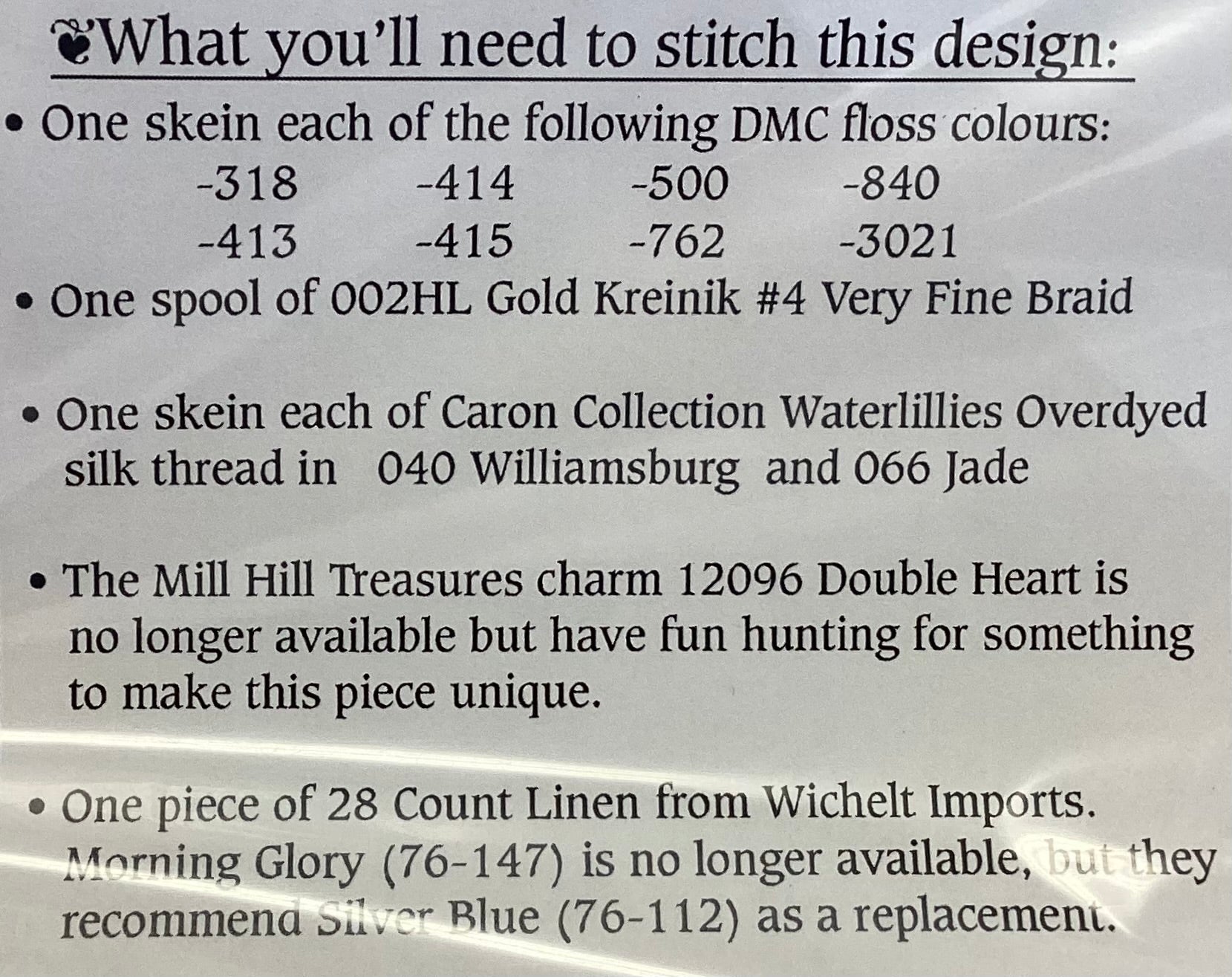 Stitch count: 96 x 193 on 28 count morning glory linen from Wichelt