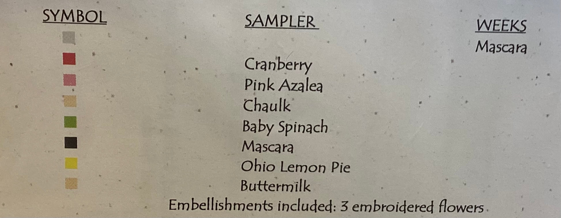 Stitch count: 78 x 83 on 28 count Lambswool linen from Wichelt