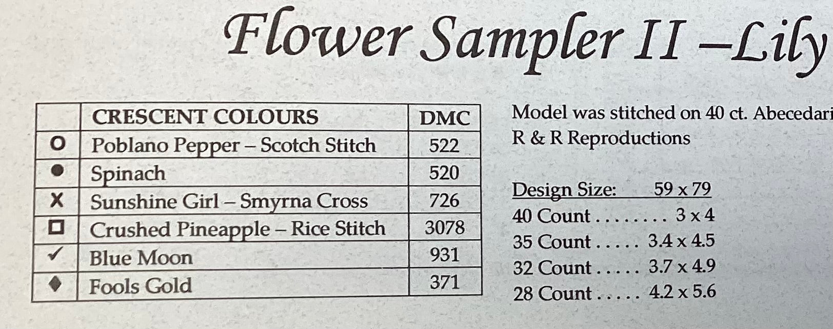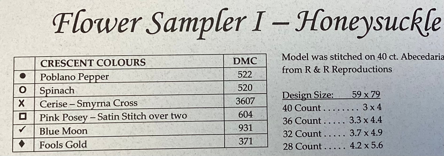 Stitch count: 59 x 79 on 40 count Abecedarian Blend from R & R Reproduction