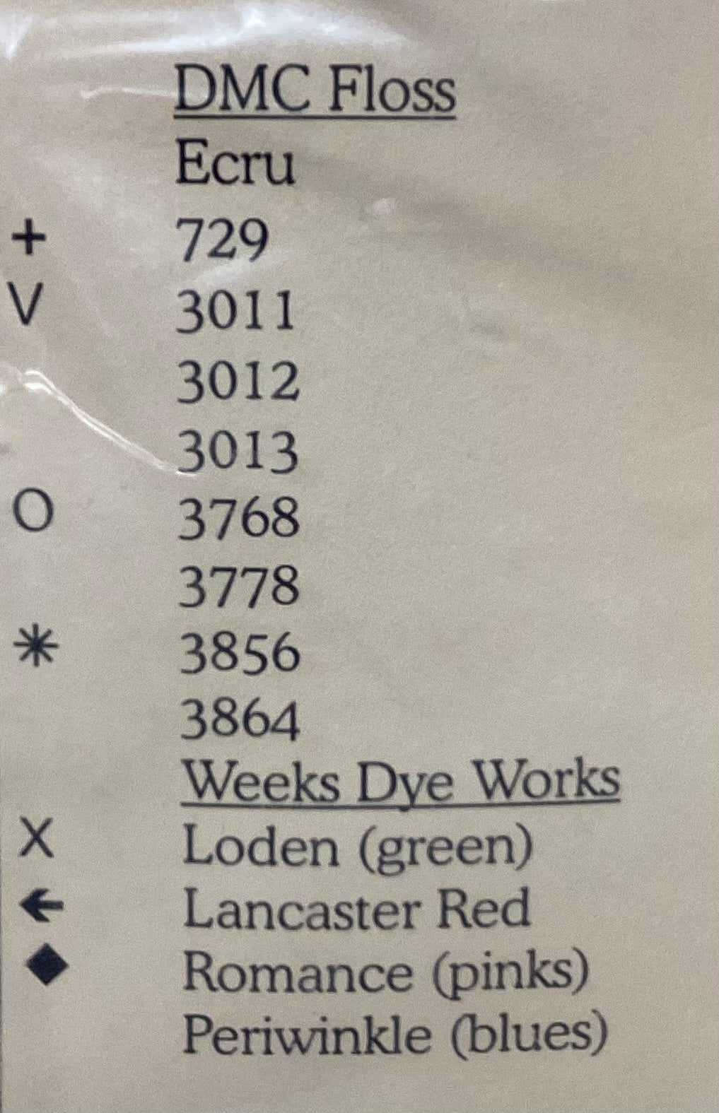 Stitch count:62 x 78 on 28 count Country French Crème linen