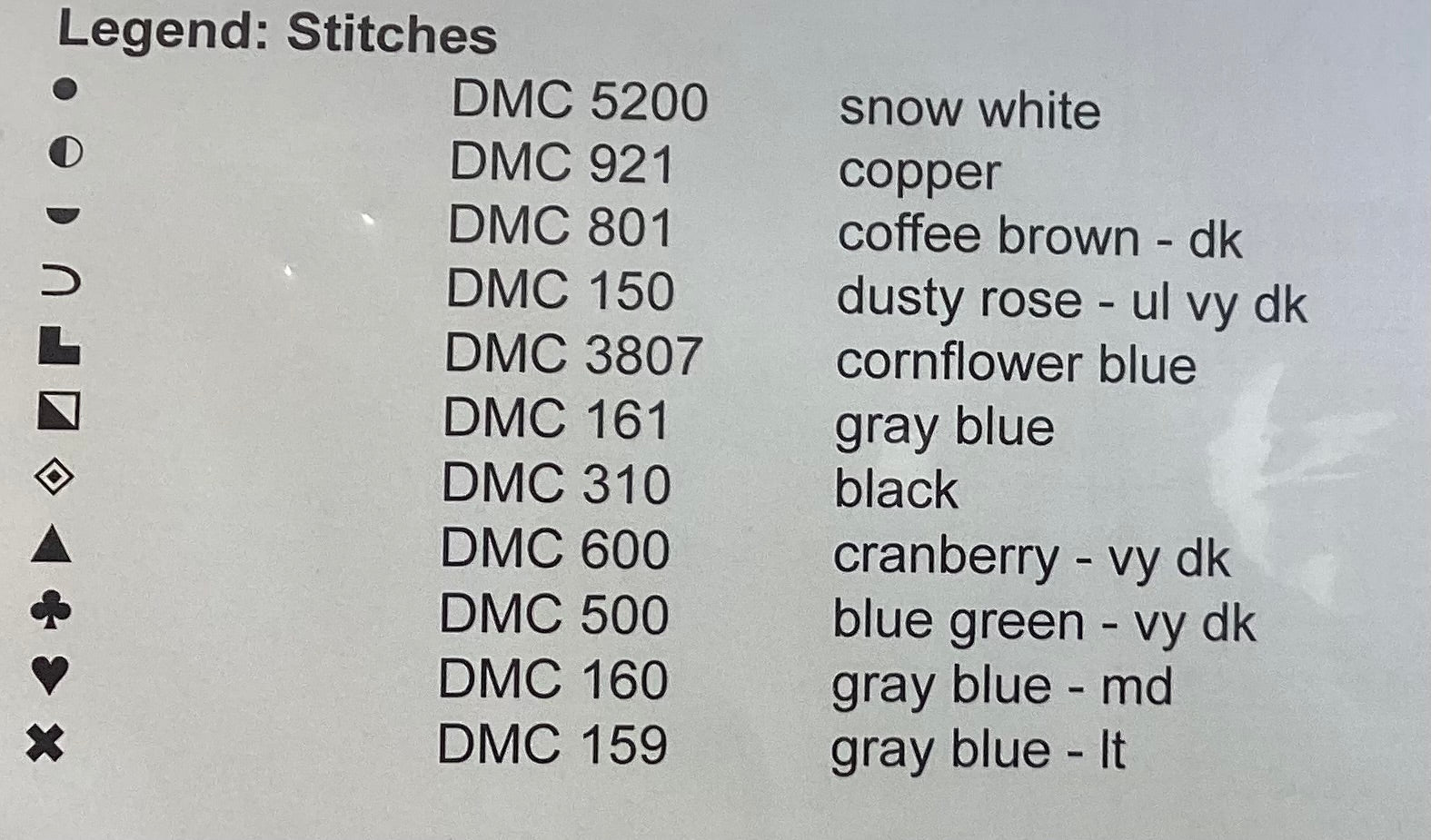 Stitch count: 73 x 64 on 28 count Opal Snowstorm Lugana of Blue Whisper Chasel