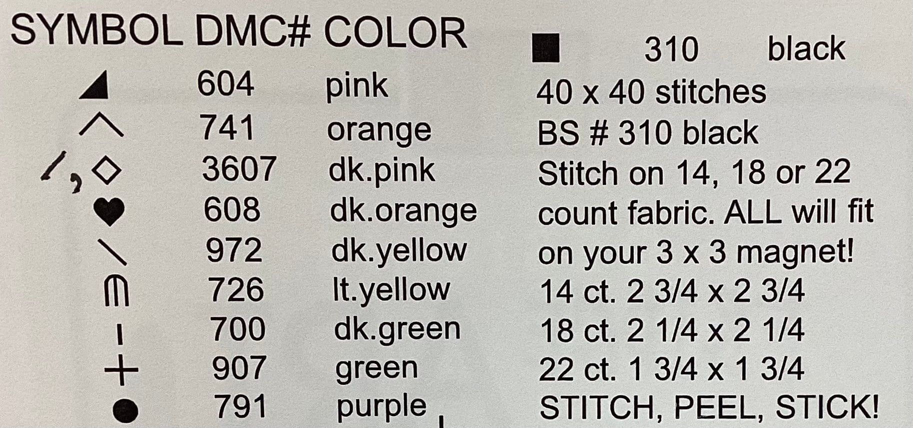 Stitch on 14, 18, or 22 count fabric, ALL counts will fit on your 3x3 magnet, which is provided!