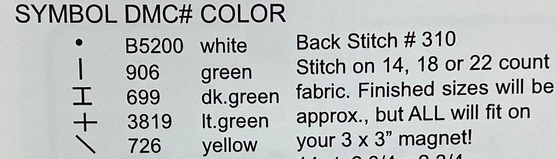 Stitch on 14, 18, or 22 count fabric, ALL counts will fit on your 3x3 magnet, which is provided!