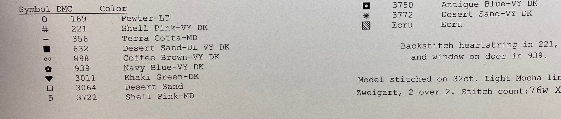 Stitch count: 76 x 104 on 32 count Light Mocha linen from Zweigart