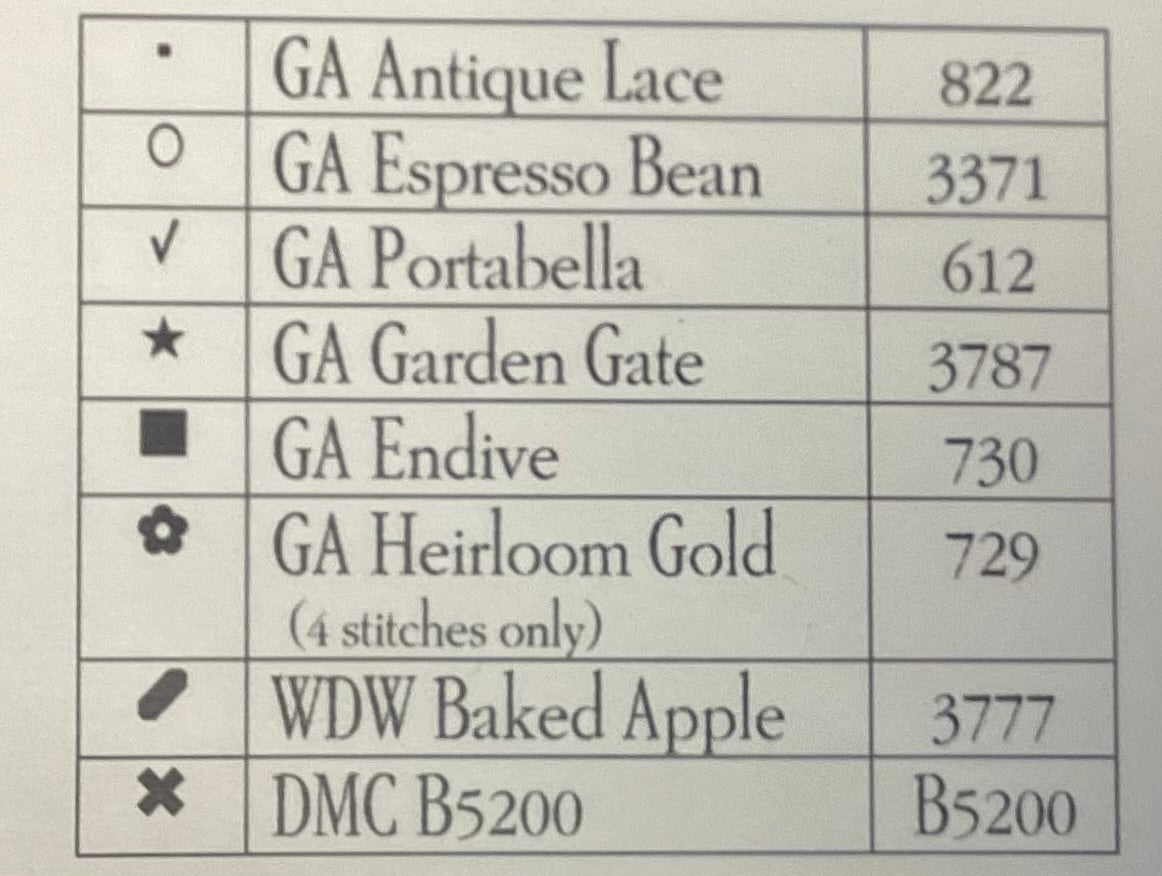Stitch count: 77 x 69 on 36 count Olde Towne Blend by R & R Reproduction