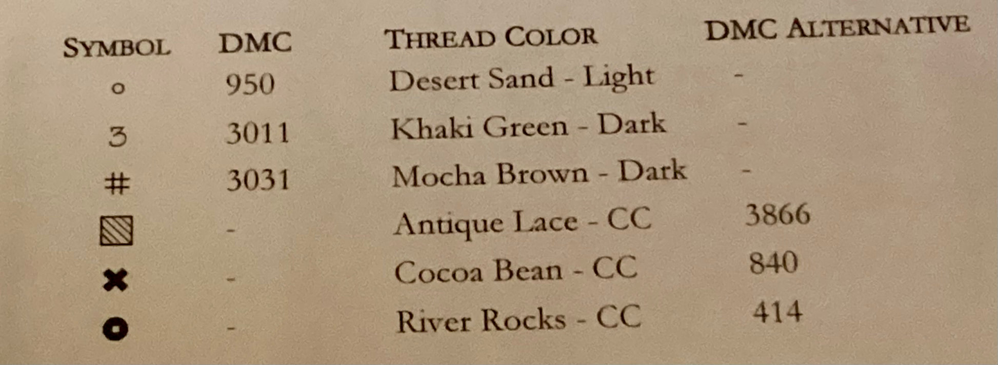 Stitch count: 113 x 113 on 30 count Broomstick Brown linen from R & R Reproduction