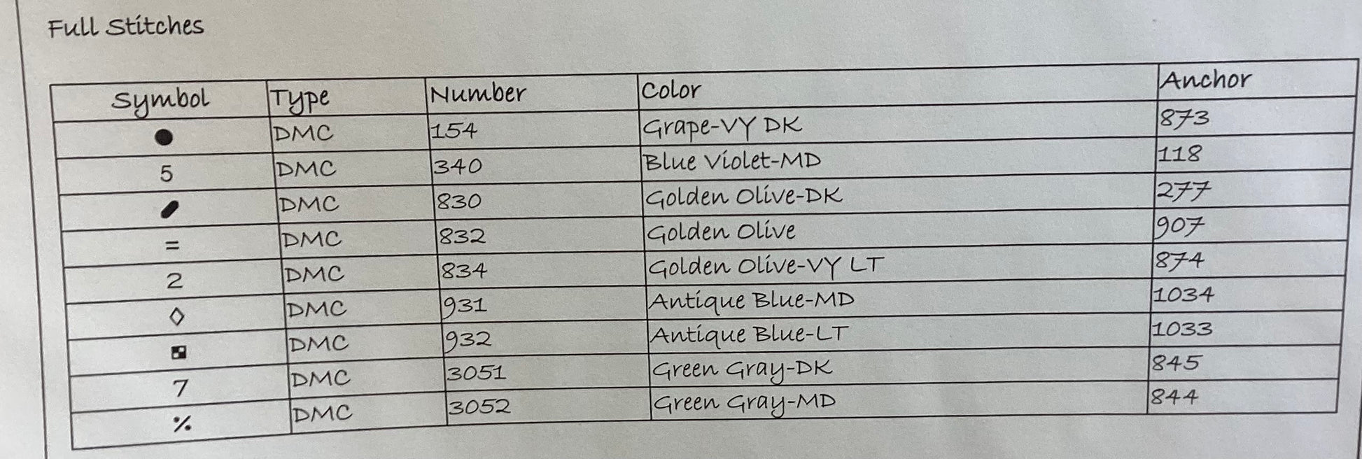 Stitch count: 147 x 64 on 28 count Thyme linen from Wichelt