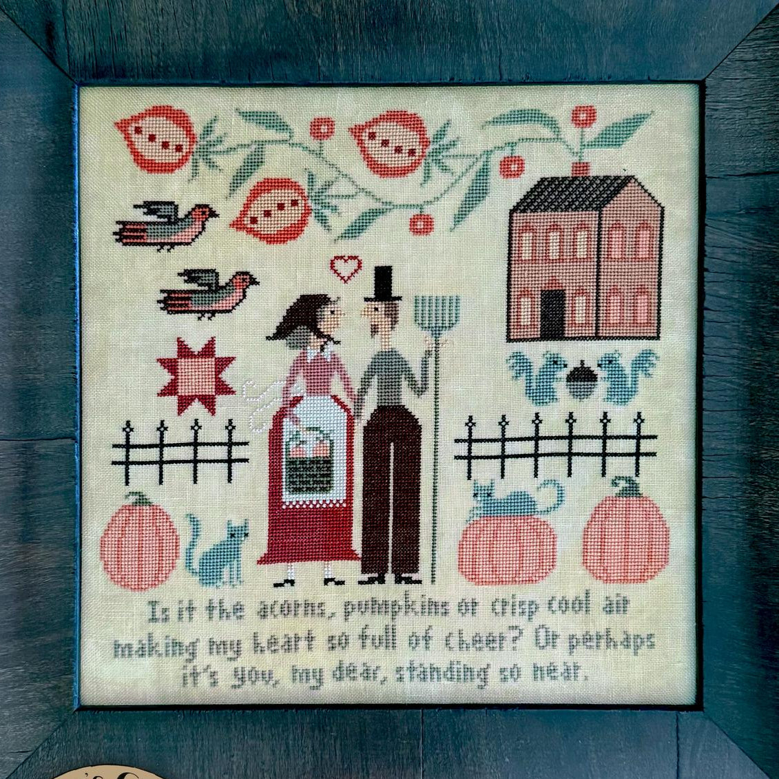 Model stitched 1 over 2 on 40ct Wheat by Fiber on a Whim.