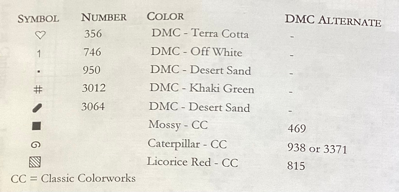 Stitch count: 67 x 121 on 30 count Creek Bed Brown from R & R Reproduction