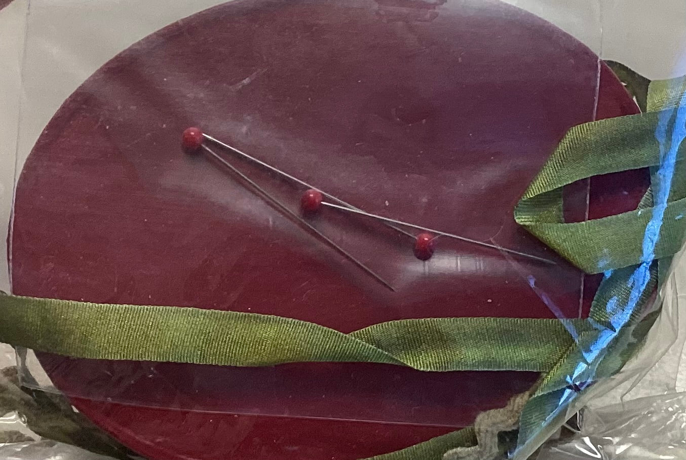 Kit includes: hand painted oval box, custom dyed silk ribbon, custom dyed Rick rack by crescent Colours, 3 red glass head pins, chart and finishing instructions!