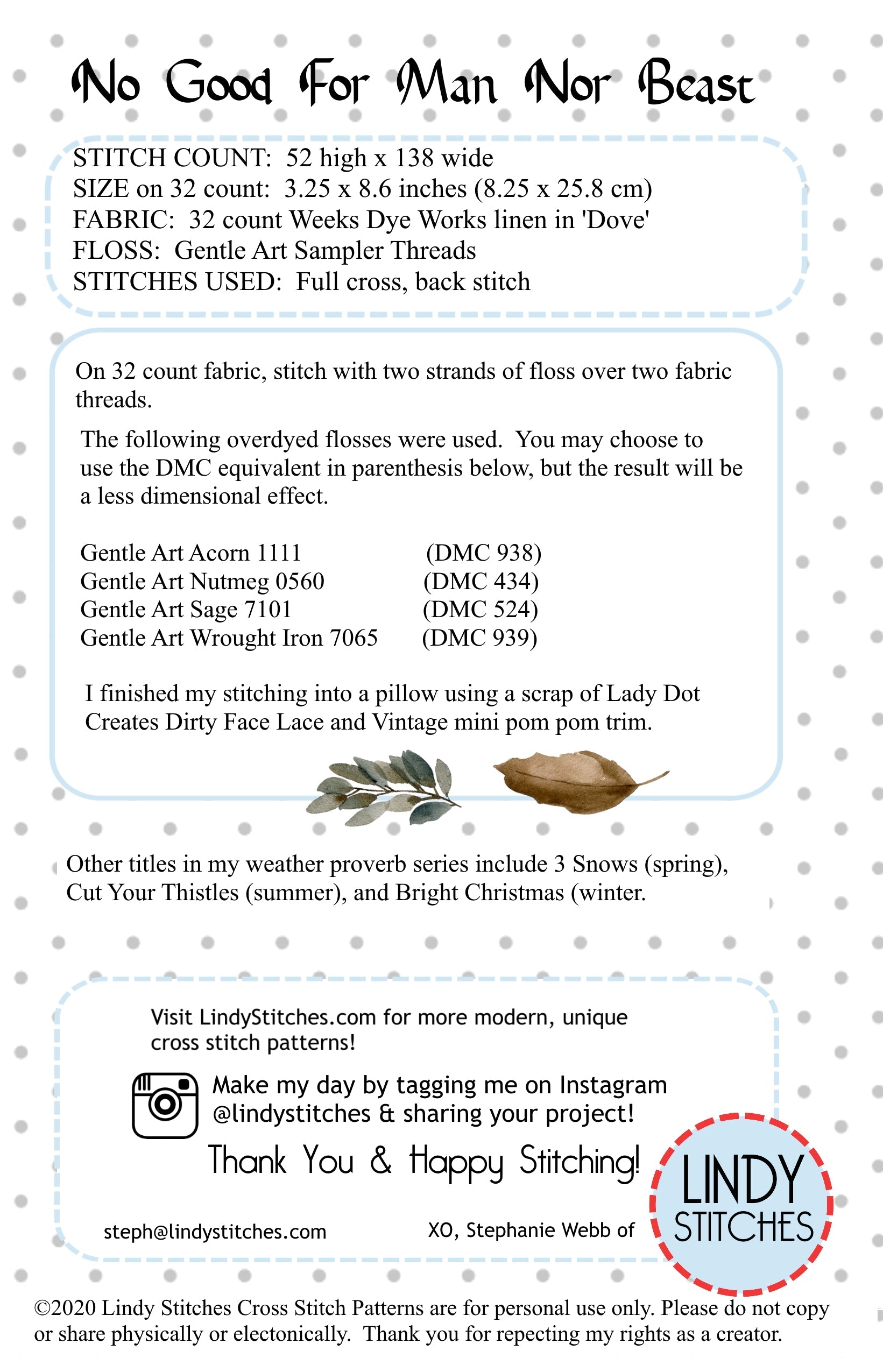 Stitch count: 52 x 138 on 32 count Dove linen by Weeks Dye Works