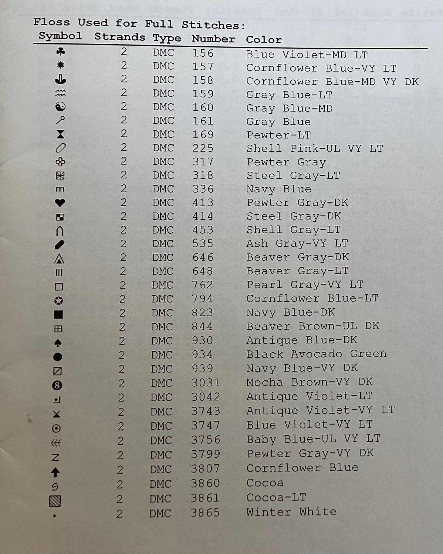 Stitch count: 196 x 215 on 14 count white or light blue grey Aida