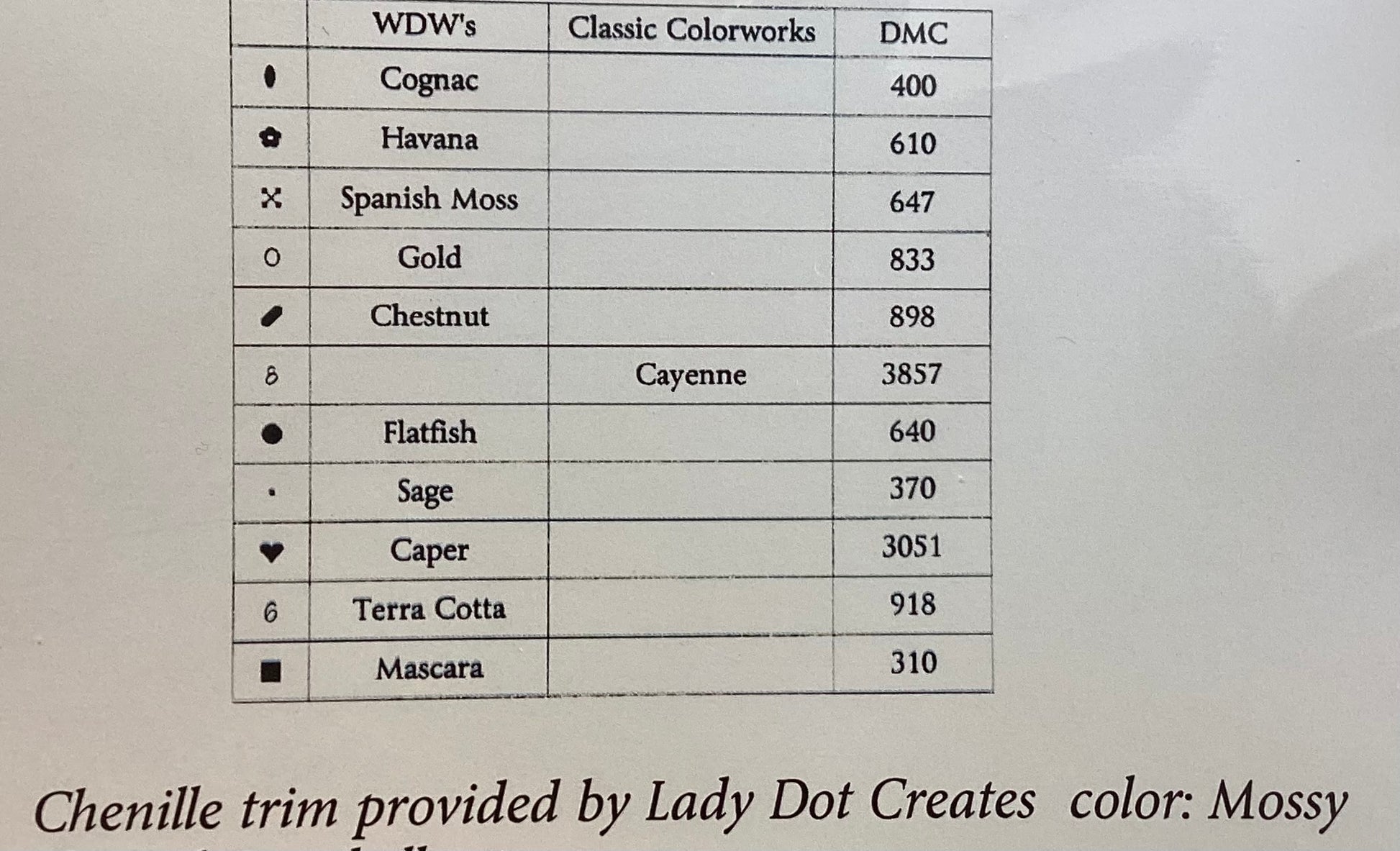 Stitch count: 89 x 81 on 40 count black linen from Weeks Dye Works