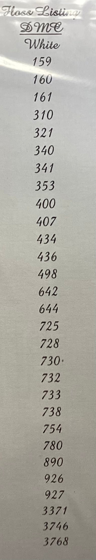 Stitch count: 160 x 208 on 32 count Dove Grey linen by Wichelt