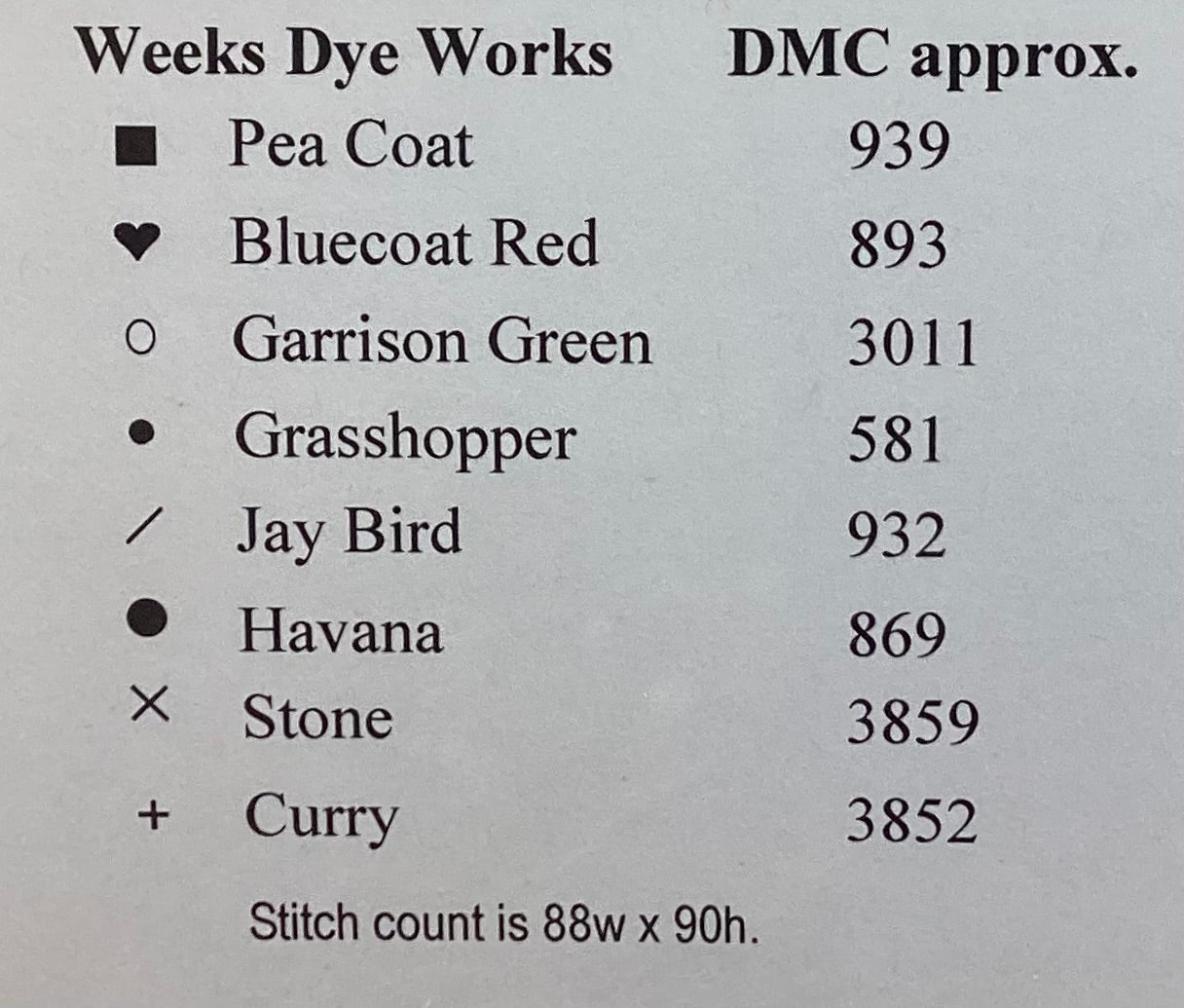 Stitch count: 88 x 90 on 30 count Beige by Weeks Dye Works