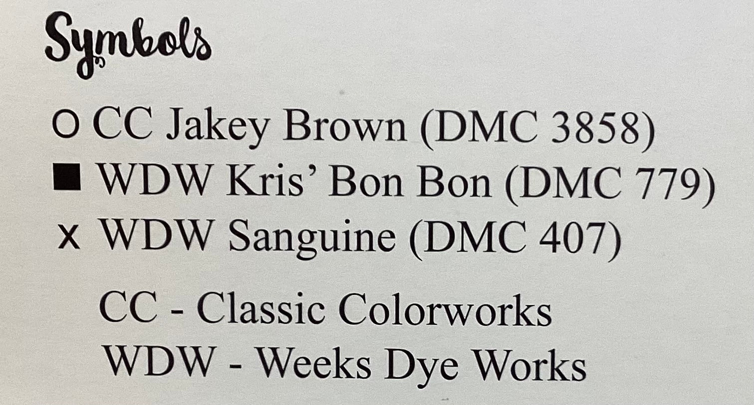 Stitch count: 56 x 20 on 32 count La-D-Da Brown by R & R Reproduction