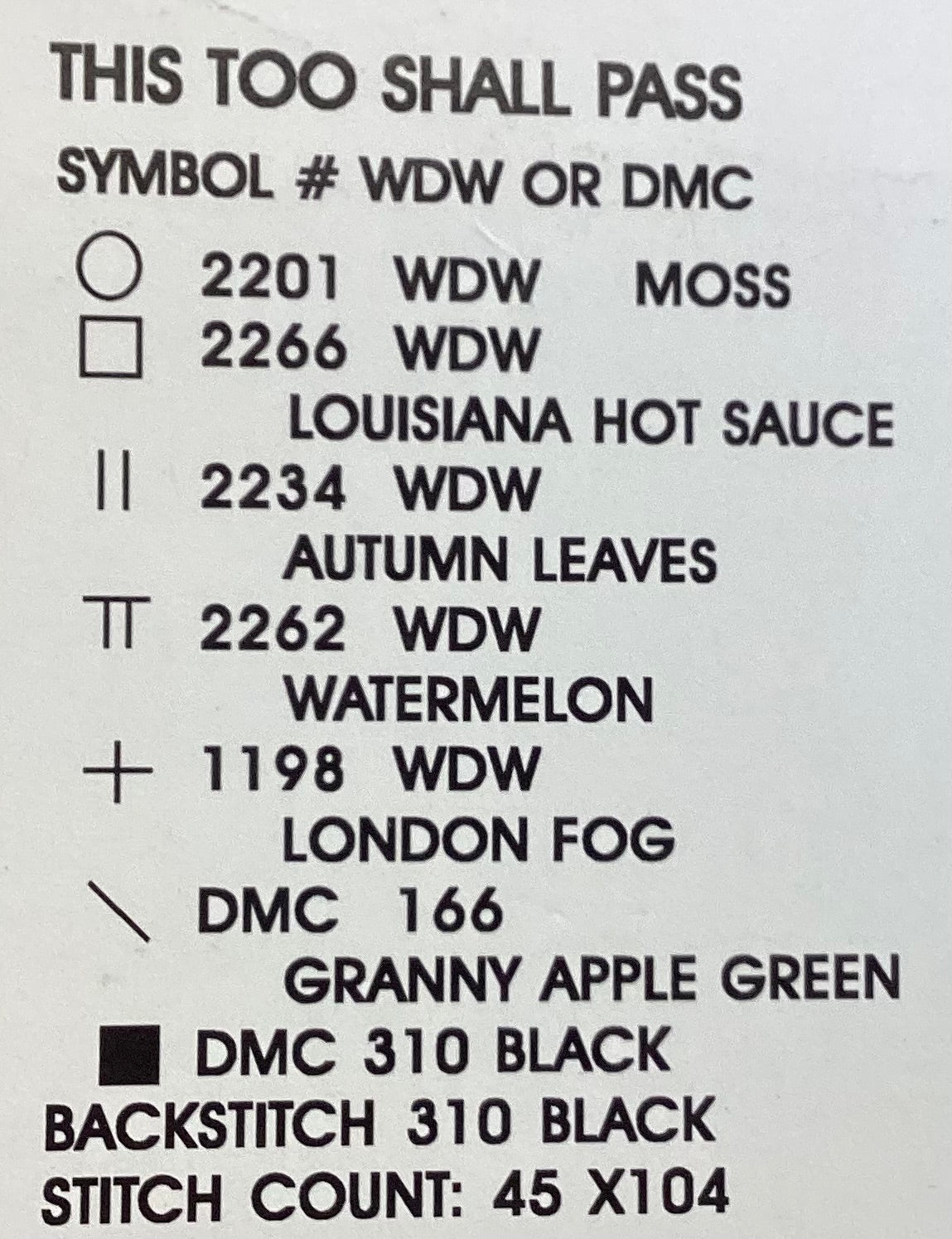 Stitch count: 45 x 104 on 30 count Vintage Grey linen by R & R Reproduction